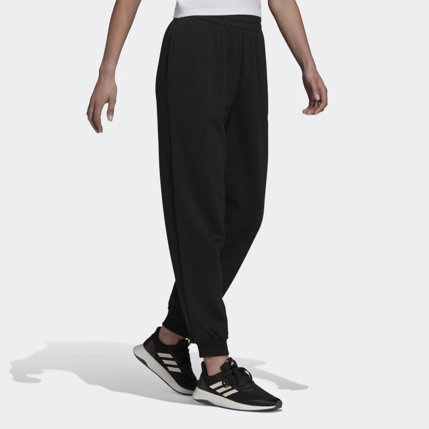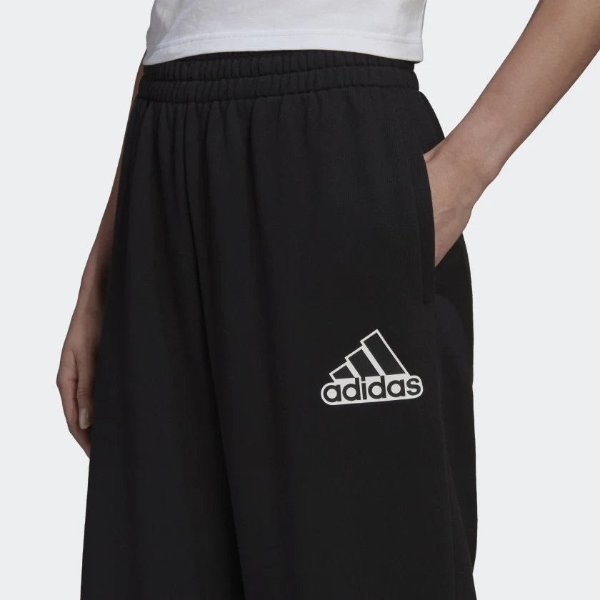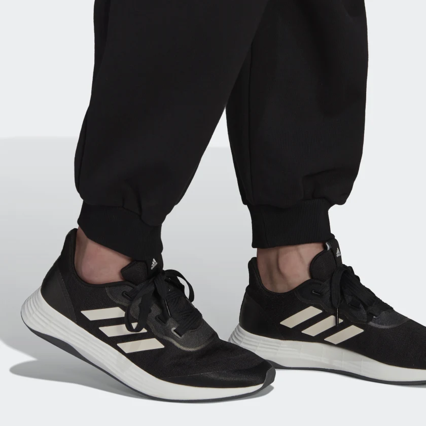 Стильные и универсальные брюки adidas. Мягкий хлопковый трикотаж дарит комфорт в течение всего дня, чем бы ты ни занималась. Свободный крой не сковывает движения, а манжеты и эластичный пояс на завязках-шнурках не дают брюкам задираться. Финальный штрих — крупный логотип adidas на бедре.